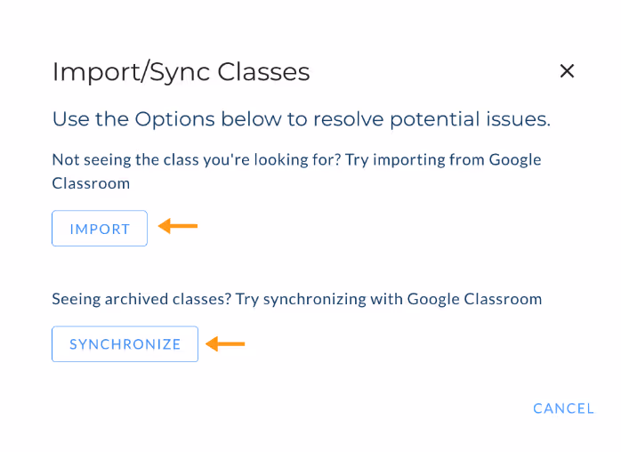 The Import/Sync option allows you to import new classes or synchronize existing classes
