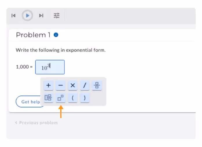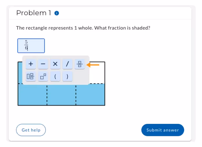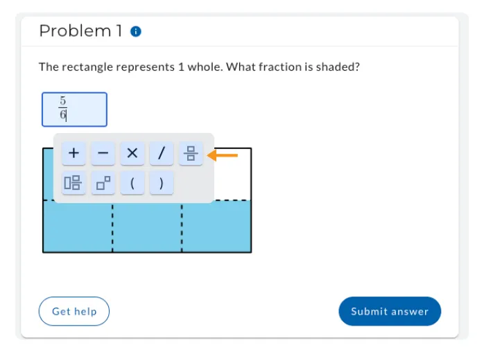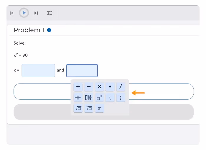 The Math Keyboard displays on fill-in problems and allows students to access math symbols and formatting options in addition to options on their standard keyboard.