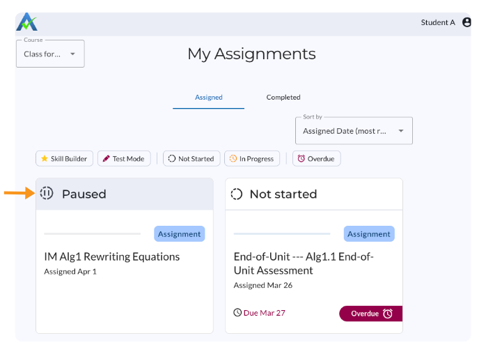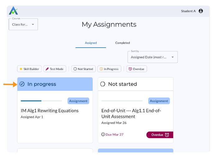 Once the teacher selects Resume Assignment, the assignment will open for students and appear as In Progress on the Assigned tab of the Student Homepage.