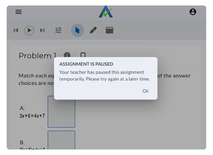 If a student has the assignment open when paused, a message will appear, notifying the student that the assignment has been paused. Once the assignment has been resumed by the teacher, students can continue working on the assignment.