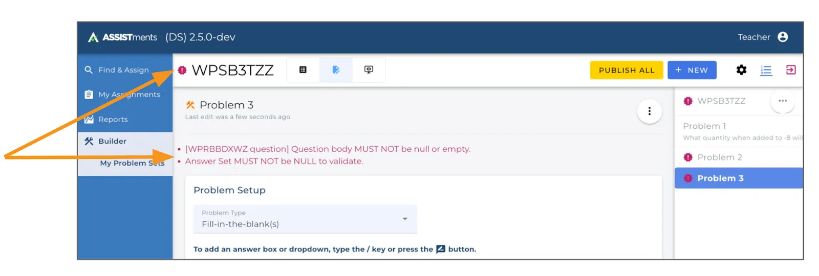 When you attempt to publish and there’s an error in one or more of your problems, a red dot will appear at the top of the screen. Below the that will be a bulleted list, in red, of the errors that need to be fixed.