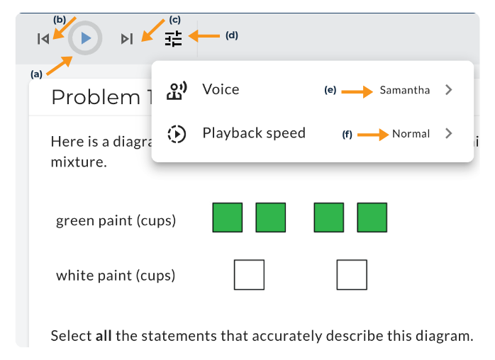Students will know that a section of a problem can be read aloud by the blue circle with the Play icon. This allows students to select which portions of the problem they would like to hear — such as the problem text, answer choices, or supports — giving them control over their listening experience.