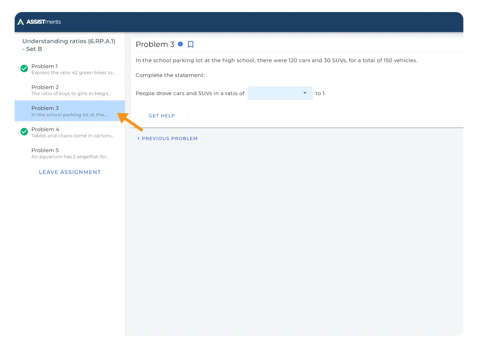 Students can choose which problem to work on by clicking a problem from the list on the left, or by using the “Previous Problem” and “Next Problem” buttons to navigate.